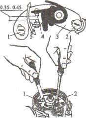 2. Перевірити зазор між контактами переривника. Поставити контакти 4 і 5 на повне розмикання і щупом перевірити зазор (0,3:–0,45 мм). Для регулювання зазору послабити стопорний гвинт пластини З нерухомого контакту і поворотом ексцентрика 2 встановити нормальний зазор.