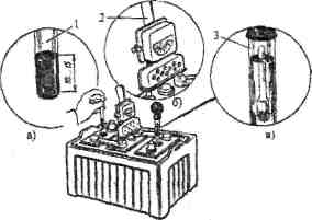 Перевірити ступінь зарядженості акумуляторної батареї навантажувальною вилкою (б) - встановити її по черзі на штирі кожного акумулятора і, утримуючи протягом 5 сек., визначити покази. Різниця в показах напруги у кожному акумуляторі не повинна перевищувати 0,1В.