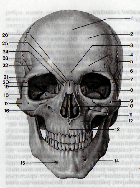 Рис.3.1. Череп взрослого человека (вид спереди): 1 – os frontale; 2 – tuber frontale; 3 – glabella; 4 – arcus superciliaris; 5 – fossa temporalis; 6 – foramen supraorbitalis; 7 – pars orbitalis ossis frontalis; 8 – ala major ossis sphenoidalis; 9 – os zygomaticum; 10 – apertura piriformis; 11 – foramen infraorbitalis; 12 – maxilla; 13 – sutura intermaxillaris; 14 – mandibula; 15 – foramen mentale; 16 – sutura zygomaticomaxillaris; 17 – os zygomaticum; 18 – fissura orbitalis inferior; 19 – canalis opticus; 20 – fissura orbitalis superior; 21 – processus zygomaticus ossis frontalis; 22 – linea temporalis; 23 – sutura coronalis; 24 – sutura nasomaxillaris; 25 – os nasale; 26 – sutura nasofrontlais.