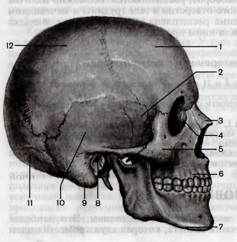Рис. 3.2 Череп взрослого человека (вид сбоку): 1 – os frontale; 2 – os sphenoidale; 3 – os nasale; 4 – os lacrimale; 5 – os zygomaticum; 6 – maxilla; 7 – mandibula; 8 – porus acusticus externus; 9 – processus mastoideus; 10 – squama ossis temporalis; 11 – os occipitale; 12 – os parietale.