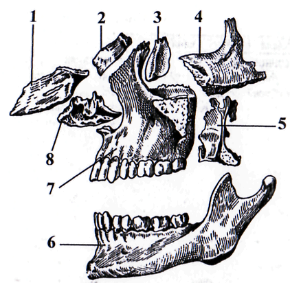 Рис. 3.4 Кости лицевого черепа: 1 – vomer; 2 – os nasale; 3 – os lacrimale; 4 – os zygomaticum; 5 – os palatinum; 6 – mandibula; 7 – maxilla; 8 – concha nasalis inferior.