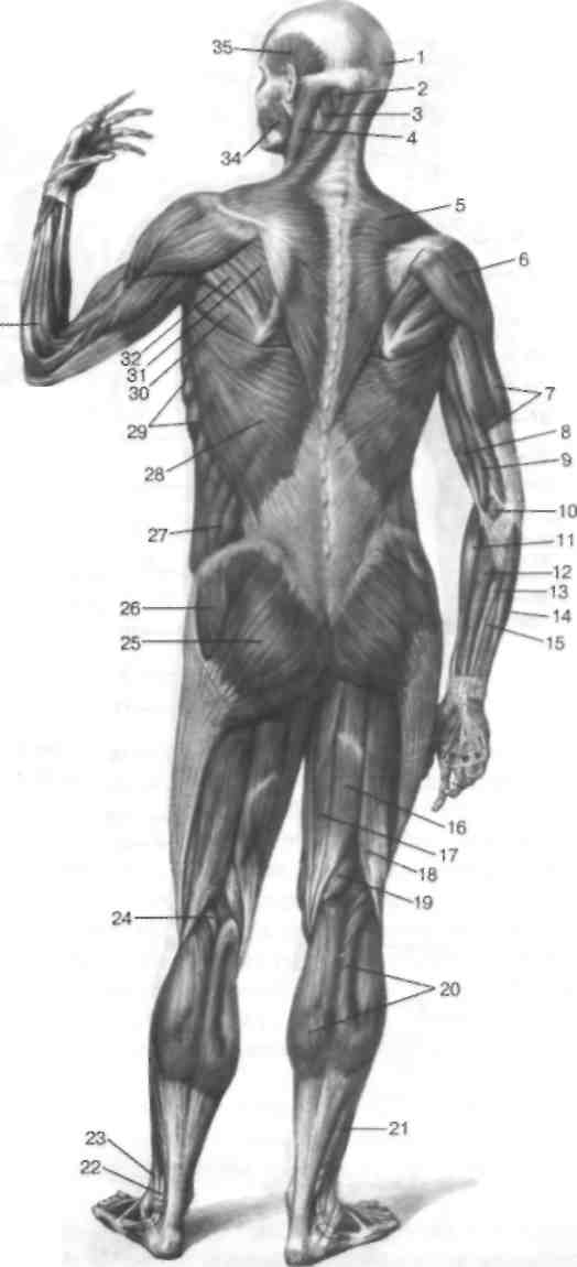 Рис. 5.1Б Мышцы, общий вид (сзади). 1 — venter occipitalis (m. occipitofrontalis); 2 — m. semispinalis capitis; 3 — m. splenitis capitis; 4 — m. sternocleidomastodeus; 5 — m. trapezius; 6 — m. deltoideus; 7 — m. triceps brachii; 8 — m. biceps brachii; 9 — m. brachialis; 10 — m. pronator teres; 11 — m. brachioradialis; 12 — m. flexor carpi radialis; 13. — m. palmaris longus; 14 — flexor carpi ulnaris; 15 — m. flexor digitorum superficialis; 16 — m. semitendinosus; 17 — m. semimembranosus; 18 — m. biceps femoris; 19 — m. semimembranosus; 20 — m. gastrocnemius; 21 — m. soleus; 22 — m. peroneus longus; 23 — m. peroneus brevis; 24 — m. plantaris; 25 — m. gluteus maximus; 26 — m. gluteus medius; 27 — m. obliquus extemus abdominis; 28 — m. latissimus dorsi; 29 — m. serratus anterior; 30 — m. teres major; 31 — m. infraspinatus; 32 — m. teres minor; 33 — m. brachioradialis; 34 — m. masseter; 35 — m. temporalis.