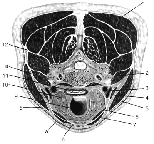 Рис. 5.20 Фасции шеи на горизонтальном распиле: 1— m. trapezius; 2 — m. scalenus anterior; 3 — сосудисто-нервный пучок; 4 — m. omohyoideus; 5 — m. sternocleidomastoideus; 6 — m. sternothyroideus;7 — m. sternohyoideus; 8 — platysma; 9 — larynx; 10 — glandula thyroidea; 11 — esophagus; 12 — фасциальная пластинка, отделяющая мышцы шеи от мышц спины;