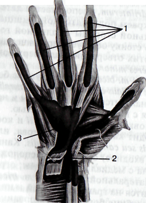 Рис. 5.25А Схема тыльных синовиальных влагалищ правой кисти: 1 — vagina synovialis tendinum mm. abduetoris; pollicis longi et extensoris poinds brevis; 2 — vagina synovialis tendinis m. extensoris poinds longi; 3 — vagina synovialis tendinurn mm. extensorum carpi radialium; 4 — vagina synovialis tendinurn mm. extensoris digitorum et extensoris Indicts; 5 - vagina synovialis tendinism. extensoris digiti minimi; 6 — vagina synovialistendinis m. extensoris carpi ulnaris Рис. 5.25Б Схема ладонных синовиальных влагалищ правой кисти: 1 — vagina synoviales tendinum digitorummenus; 2 — vagina synovialis tendinis m. flexoris pollicis longi; 3 - vugina synovialis communis musculorum flexorum ПРИМЕЧАНИЕ: на кисти образуются: 1. Фиброзные футляры: 1) для сухожилий мышц-разгибателей (между lamina superficialis et lamina profunda f. dorsalis manus propriae); 2) для сухожилий мышц-сгибателей и червеобразных мышц; 3) срединное ложе (между lamina superficialis et lamina profunda f. palmaris propriae) 2. Костно-фиброзные футляры: 1) для мышц тенара; 2) для мышц гипотенара; 3) общий - для тыльных и ладонных межкостных мышц.