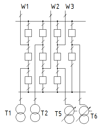 Достоинства: 1. Ремонт любой системы шин без перерыва электроснабжения. 2. При аварии на шинах, перерыв в электроснабжении на время перевода на другую систему шин. 3. Схема гибкая в отношении расширения. 4. Экономична