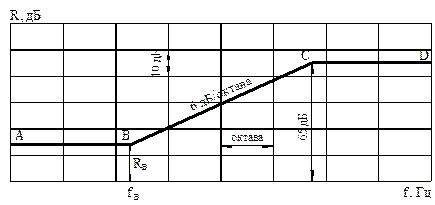 Построение частотной характеристики производится в следующей последовательности: из точки влево проводится горизонтальный отрезок , а вправо от точки проводится отрезок с наклоном 6 дБ на октаву до точки с ординатой = 65 дБ, из точки вправо проводится горизонтальный отрезок . Если точка лежит за пределами нормируемого диапазона частот ( > 3150 Гц), отрезок отсутствует.