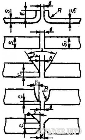Рис. 14. Примеры подготовки кромок: I - высота отбортовки; R - радиус закруглений; β - угол скоса кромок; α - угол разделки кромок; S и S1 - толщина металла