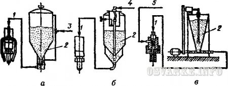 Рис. 52. Схема подачи флюса: а - с внешней подачей; б - однопроводная под высоким давлением; в - с механической подачей; 1 - газофлюсовая смесь; 2 - флюс; 3 - флюсонесущий газ; 4 - кислородно-флюсовая смесь; 5 – режущий кислород