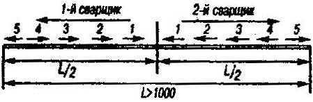 3. Задача. Назовите и схематично изобразите способ сварки листовой конструкции длиной 1300 мм. Сварочный шов относится к длинномерным, поэтому используют обратноступенчатый способ сварки. Сущность его состоит в том, что весь шов разбивают на участки длиной 100-350 мм с таким расчетом, чтобы каждый из них мог быть выполнен целым числом электродов (двумя, тремя и т. д.). При этом переход от участка к участку совмещается со сменой электрода. Каждый участок заваривается в направлении, обратном общему направлению сварки, а последний всегда заваривается «на выход». В данном случае возможно организовать работу одновременно двух сварщиков.