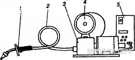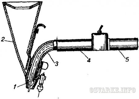 Рис. 55. Держатель полуавтомата для сварки под флюсом: 1 - наконечник; 2 - бункер для флюса; 3 - сварочная проволока; 4 - ручка; 5 - шланг