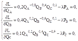 Побудувавши функцію Лагранжа визначимо умови її максимізації за допомогою часткових похідних, кожну з яких прирівняємо нулю. Таким чином одержимо систему з 3 рівнянь: