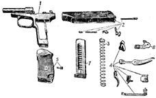 9-мм пистолет Макарова (ПМ) состоит из следующих основных частей и механизмов (рис. 2): - рамки со стволом и спусковой скобой; - затвора с ударником, выбрасывателем и предохранителем; - возвратной пружины; - ударно-спускового механизма; - рукоятки с винтом; - затворной задержки; - магазина.