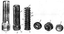 Затвор рис. 19 а – остов затвора; б – ударник; в – выбрасыватель; 1 – вырез для гильзы; 2 – вырез для выбрасывателя; 3 – ведущий выступ; 4 – отверстие для оси выбрасывателя; 5 – боевой выступ; 6 – продольный паз для отражательного выступа; 7 – пружина выбрасывателя; 8 – ось выбрасывателя; 9 – шпилька