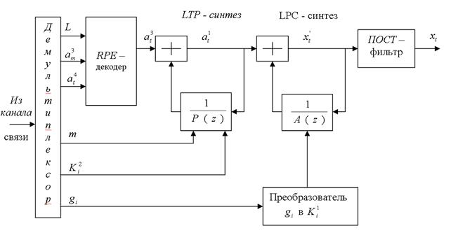 З каналу зв'язку дані за допомогою демультиплексора розподіляються по різних блоках декодера. На RPE декодер надходять номер послідовності