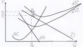 2) Оптимальный объём прибыли ищем по правилу MC=MR. Прибыль будет равна площади прямоугольника Q1O1P1O, а издержки Q1O2P2O. Тогда убытки будут равны площади прямоугольника P2P1O1O2. 3)Проблема субсидирования, т.к. предприятие терпит убытки.