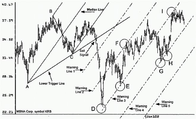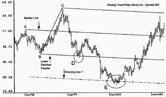 График показывает MBNA Corporation (KRB). Вилы и нижняя Сигнальная Линия проведены через разворотные точки А, B и C. Отметьте, что после разворотной точки C цена не продвигается вверх и не доходит до Срединной Линии. Когда цена падает ниже нижней Сигнальной линии, генерируется сигнал продажи. После этого сигнала цена резко падает и рисует острое дно сразу над Предупреждающей Линией 3 в точке D. По мере своего продвижения вверх после точки D цена обозначает снижения напротив Предупреждающих Линий в точках E, G и H, а вершины - напротив Предупреждающих Линий в точках F и I. Обратите внимание, что после точки D Предупреждающих Линии 2 и 3 работают как канал линий тренда, пока цена не пробьется ниже Предупреждающей Линии 3 вниз, к точке G. Затем в качестве канала начинают работать Предупреждающие Линии 3 и 4. Ниже мы видим долгосрочный недельный график Philip Morris (MO). Вилы и одна Предупреждающая Линия проведены по точкам А, B и C. После разворотной точки C цена движется вниз двумя волнами. Первая волна делает дно в точке D, на нижней параллельной линии Вил. Вторая волна определяет дно на Предупреждающей Линии в точке E. После дна на этой Предупреждающей Линии цена почти целый год идет вверх.