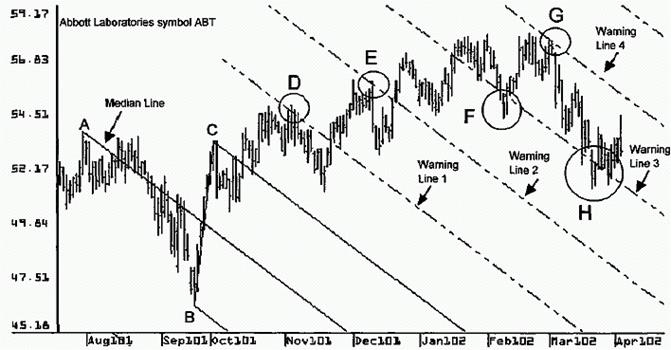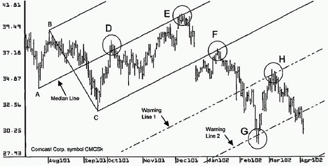 График выше - Abbott Laboratories (АВТ). Вилы и четыре верхние Предупреждающие Линии проведены с помощью разворотных точек А, B и C. После разворотной точки C цена не падает до Срединной Линии, что является признаком силы рынка. По мере своего продвижения вверх, цена делает вершину против Предупреждающей Линии 1 в точке D, а также против Предупреждающей Линии 2 в точке E и против Предупреждающей Линии 4 в точке G. Этот рынок также делает два дна против Предупреждающей Линии 3 в точках F и H. Ниже приведен график Comcast corporation (CMCSK). На этом графике Вилы и две нижние Предупреждающие Линии проведены с помощью разворотных точек А, B, и C. После разворотной точки C цена идет вверх и делает вершину в точке D против Срединной Линии. Затем цена делает вторую вершину против Срединной Линии в точке E. После точки E цена резко падает и свою следующую вершину делает против нижней параллельной линии Вил в точке F. После точки F цены быстро идет вниз к Предупреждающей Линии 2 в точке G. Наконец, цена движется вверх и обозначает вершину против Предупреждающей Линии 1 в точке H. Это показывает, что почти все существенные колебания сделаны против одной из линий Вил или Предупреждающих Линий.
