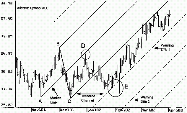 Выше приведен простейший пример этого, с помощью графика Allstate (ALL). Вилы и несколько Предупреждающих Линий проведены с помощью разворотных точек А, B, и C. После разворотной точки C рынок растет до Срединной Линии в точке D. Затем цена падает до Предупреждающей Линии 1 в точке E и делает дно. После точки E нижняя параллельная линия Вил и Предупреждающая Линии 1 работают, как канал восходящего тренда. Следующий график показывает акции Boeing (BA). Вилы и четыре Предупреждающие Линии проведены из разворотных точек А,B, и C. После разворотной точки C цена растет до вершины сразу под верхней параллельной линии Вил в точке D. Затем цена падает и входит в зону боковой консолидации против нижней параллельной линии Вил в точке E. В конце концов, из точки E цена идет вниз до Предупреждающей Линии 4 и делает дно в точке F. Это показывает нам, что уровни цены, определяемые Вилами и Предупреждающими Линиями - неплохая оценка размеров будущих колебаний Boeing.