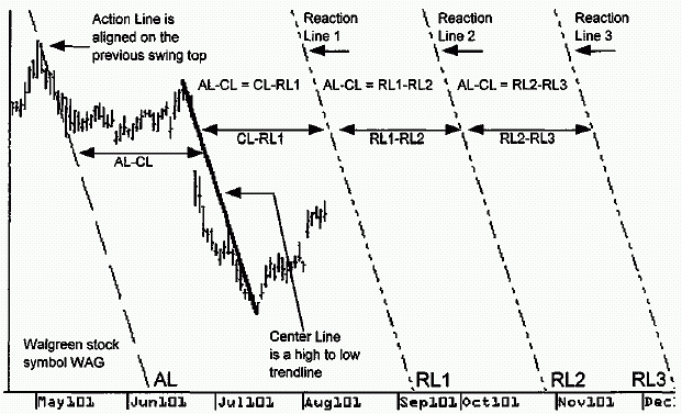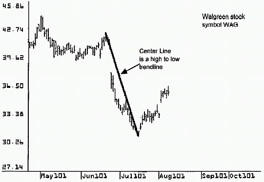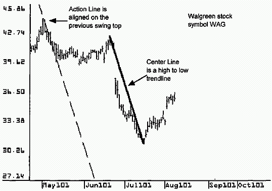 Лучшие методы линий тренда Алана Эндрюса плюс пять новых техник Часть 8 Patrick Mikula Шаг 1: Линия Центра Разница между Методами Действия-Реакции 1 и 2 заключается в числе линий Действия и вычислении расположения Линий Реакции. Линия Действия и Линии Реакции будут обсуждаться далее, а сейчас мы поговорим о Линии Центра. Первый шаг в применении Метода Действия-Реакции 2 - выбрать Линию Центра. Правила выбора Линии Центра у Методов Действия-Реакции 1 и 2 одинаковы. Линия Центра может быть Срединной Линией, линией тренда или Мультипивотной Линией. Линия Центра не может быть одной из параллельных линий, например, верхней или нижней параллельной линией Вил или Предупреждающей Линией. График ниже представляет акции Walgreen (WAG). На этом графике между максимумом и минимумом проведена линия тренда. Эта линия использована в качестве Линии Центра, чтобы пояснить Метод Действия-Реакции 2.
