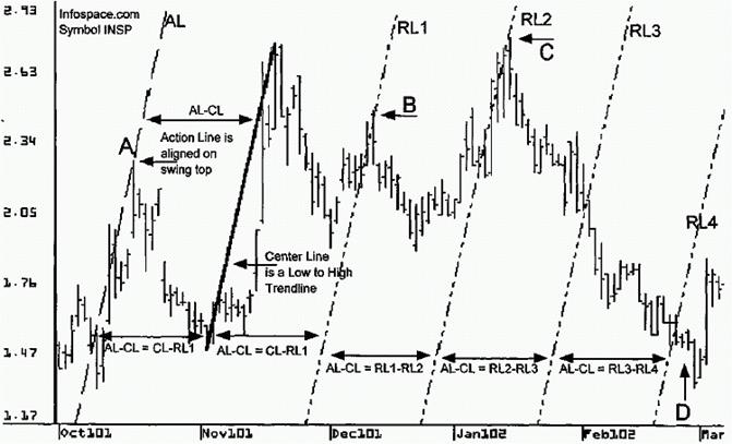 График ниже демонстрирует lnfospace.com (INSP). Здесь применен Метод Действия-Реакции 2. Линия Центра - линия тренда между максимумом и минимумом с левой стороны этого графика. Проведена одна Линия Действия - "AL", сопоставленная с вершиной колебания в точке А. Используя дистанцию между Линией Действия и Линией Центра, на равном расстоянии друг от друга проводятся четыре Линии Реакции. Когда цена достигает Линии Реакции 1 (RL1), она рисует вершину в точке B. Когда цена касается Линии Реакции 2 (RL2), появляется вершина в точке C. Сразу после Линии Реакции 4 (RL4) цена показывает дно в точке D.