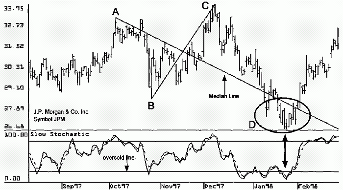 Ниже показан еще один график J.P. Morgan (JPM). Нисходящая Линия Медианы проведена от разворотных точек A, B и С, к графику добавлен Медленный Стохастик. На этом графике цена падает до Срединной Линии в точке D, а Медленный Стохастик также располагается ниже линии перепроданности. Это сетап высокой вероятности, когда трейдер покупает от основания колебания в точке D и держит позицию в течение следующего движения вверх.