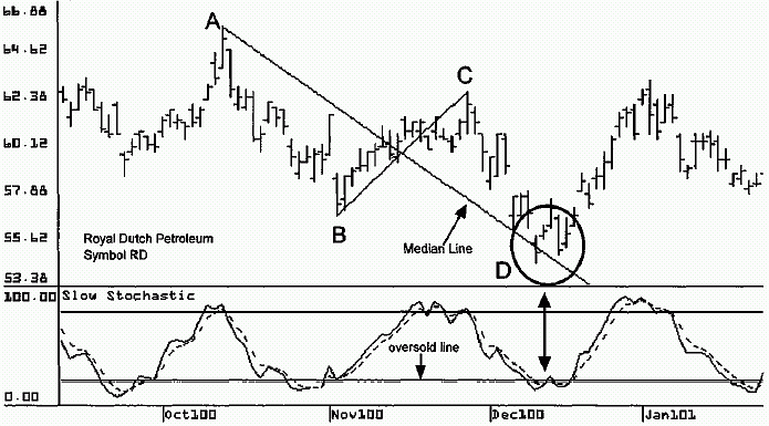 Рассмотрим график Royal Dutch Petroleum (RD). Срединная Линия проведена от разворотных точек A, B и С, к графику добавлен Медленный Стохастик. На этом графике цена падает до Срединной Линии в точке D, а Медленный Стохастик также лежит ниже уровня перепроданности. Это сетап высокой вероятности, когда трейдер покупает от начала колебания в точке D и держит позицию в течение следующего хода вверх.