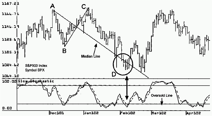 Далее видим график Индекса S&P500 (SPX). Разворотные точки A, B и С использованы для проведения Срединной Линии, на график нанесен Медленный Стохастик. На этом графике цена падает до Срединной Линии в точке D, а Медленный Стохастик также располагается ниже линии перепроданности. Это сетап высокой вероятности, когда трейдер покупает от основания колебания в точке D и держит позицию в течение следующего движения вверх.