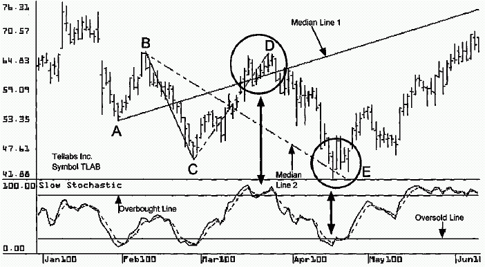 Ниже - график Tellabs (TAB). Срединная Линия проведена от разворотных точек A, B и С, к графику добавлен Медленный Стохастик. Цена растет от разворотной точки С до Срединной Линии в точке D, а Стохастик располагается выше уровня перекупленности. Это Это сетап высокой вероятности. Трейдер продает в короткую на вершине колебания в точке D и держит позицию а течение следующего колебания вниз. Затем проводится вторая Срединная Линия, используя разворотные точки В, С и D. Цена падает от разворотной точки D до второй Срединной Линии в точке E, причем Стохастик также лежит ниже линии перепроданности. Это еще один сетап высокой вероятности. На сей раз трейдер покупает в длинную от основания колебания в точке E и держит позицию в течение следующего хода вверх.