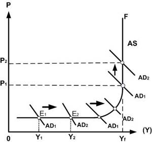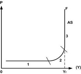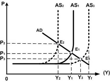 При анализе макроэкономического равновесия используется также кейсианская форма кривой совокупного предложения, Эта кривая имеет три ярко выраженных участка: горизонтальный (1), нарастающий (2) и вертикальный (3) (рис.4.4.) Горизонтальный (кейсианский) отрезок кривой (1) совокупного предложения представляет собой объем производства Y при неполном использовании факторов производства (цены и заработная плата негибки, т.е. не способны изменяться). При существующем недоиспользовании факторов производства (материальных и трудовых ресурсов) их можно задействовать без изменения уровня цен (Р), ибо как безработный, так и собственник материальных ресурсов готовы на получение работы при существующих ставках заработной платы и на продажу ресурсов по ценам, которые соответствуют сложившемуся состоянию производства. На этом участке возможно увеличение объема производства за счет вовлечения незадействованных факторов производства без изменения уровня цен. Промежуточный отрезок кривой (2) характеризует экономику частичной занятости, когда цены и заработная плата обладают относительной гибкостью. На этом участке возможно наращивание объема производства, но этот рост будет сопровождаться ростом уровня цен.