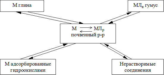 На рисунке Лр – растворимые лиганды, какими являются органические кислоты с малым молекулярным весом, а Лн – нерастворимые. Реакция металлов (М) с гумусовыми веществами включает частично и ионный обмен. Конечно, в почве могут присутствовать и другие формы металлов, которые не участвуют непосредственно в этом равновесии, например, металлы из кристаллической решетки первичных и вторичных минералов, а также металлы из живых организмов и их отмерших остатков. Наблюдение за изменением тяжелых металлов в почве невозможно без знания факторов, определяющих их подвижность. Процессы передвижения удержания, обуславливающие поведение тяжелых металлов в почве, мало чем отличаются от процессов, определяющих поведение других катионов. Хотя тяжелые металлы иногда обнаруживаются в почвах в низких концентрациях, они формируют устойчивые комплексы с органическими соединениями и вступают в специфические реакции адсорбции легче, чем щелочные и щелочноземельные металлы. Миграция тяжелых металлов в почвах может происходить с жидкостью и суспензией при помощи корней растений или почвенных микроорганизмов. Миграции растворимых соединений происходит вместе с почвенным раствором (диффузия) или путем перемещения самой жидкости. Вымывание глин и органического вещества приводит к миграции всех связанных с ними металлов. Миграция летучих веществ в газообразной форме, например, диметила ртути, носит случайный характер, и этот способ перемещения не имеет особого значения. Миграция в твердой фазе и проникновение в кристаллическую решетку являются больше механизмом связывания, чем перемещения. Тяжелые металлы могут быть внесены или адсорбированы микроорганизмами, которые в свою очередь, способны участвовать в миграции соответствующих металлов.
