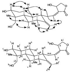 Результати аналізу двовимірного спектру HMBC можна представити у вигляді таблиці, що дуже зручно для аналізу стереохімічної будови молекули. Прикладом такої таблиці є Табл. 16. Слабкі кореляції, які відповідають маленьким константам ССВ, позначені як (w) (не всі вони спостерігаються на Рис. 40 на вибраному нижньому рівні контурної карти).