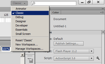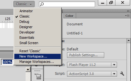 Выбор нового рабочего пространства Flash предлагает несколько готовых вариантов расположения панелей на экране, которые могут подойти некоторым пользователям для работы. Они перечислены в выпадающем меню в правом верхнем углу рабочего пространства Flash CS6. Вы можете их также увидеть через главное меню программы Window > Workspace.