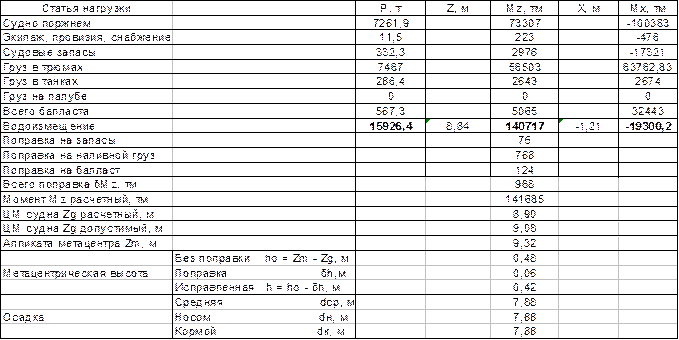Измененное значение водоизмещения и статического момента водоизмещения: Мx1 = Мx + Мx0 = -51743 + 33809 = - 17934тм; Δ1 = Δ + ∑Рi = 15359,1 + 601,7 = 15960,8т; где Δ, Мx – водоизмещение и статический момент водоизмещения «на приход»; ∑Рi - масса принятого балласта. Измененное значение абсциссы центра тяжести судна: xg1 = Mx1/Δ1 = -17934 / 15960,8 = -1,12; xс1 = -1,22 (по таблице гидростатических элементов); xg1 ≠ xс1, поэтому определяем остаточный дифферент: Df = Δ1(xg1 – xс1)/М1м = 15960,8 · 0,1 / 18964 = 0,08м; => Мx0 = -0,08 · 18964 = -1517тм; тогда: