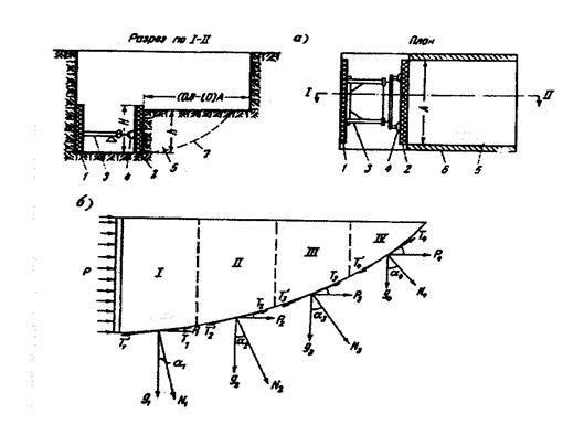 60-сурет. Шурфтағы тыңтіреудің құлауы үшін арналған қондырғы: а – қондырғы сұлбасы; 1 – қыспа винт; 2 – тіреуіш арқалық; 3–диномометр; 4 – штамп; 5 – жыныс тыңтіреуіші; 6 – грунт призмасының құлауы кезінде дамитын күштің сұлбасы; I,I,III –тыңтіркеу бөлігін бөлген блоктар 6.6.Шурфтағы жыныстар призмаларын сығу әдісімен жылжуға сынау Бұл әдіс Екатеринбург қаласындағы құрылыс бойынша ғылыми-зерттеу институтында жасалған. Ол жыныстың призмалық блогы, оның бүйір қабырғасына бекітілген көлденең күштің әсерінен сығылуы (выпирание) бойынша анықталады. Зерттелетін блок қалған массивтен бүйірлік кесулермен бөлінген. Призмалардың жылжуына грунттарды сынау үшін арналған қондырғы сұлбасы 61--суретте көрсетілген. Зерттеулердің техникалық берілгендері: 1. Жылжымалы тік қабырғаның керекті өлшемдері: 2. Жылжымалы тік қабырғаның Н биіктігі басқа да ірі қосымшалардың өлшемдерінен кем дегенде 5 есе үлкен болу керек; 3. Сығылатын массив биіктігі Н=0,8-1,0 аралығында, ұзындығы А; 4. Мыжылған грунтқа толтырылған кесінді ені 0,05-0,1 м болу керек.