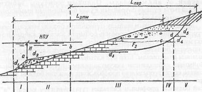 70- сурет. Г.С. Золотаревтың әдісі бойынша болжау жасауға арналған есептеу сызбасы: I – суасты қайраңының жарқабағы; II – суасты қайраңының аккумулятивті бөлігі; III– суасты қайраңының абразиялық бөлігі; Lжж – жөндеу жұмысты жүргізілетін белдемнің ені; Lқ – суасты қайраңының ені.