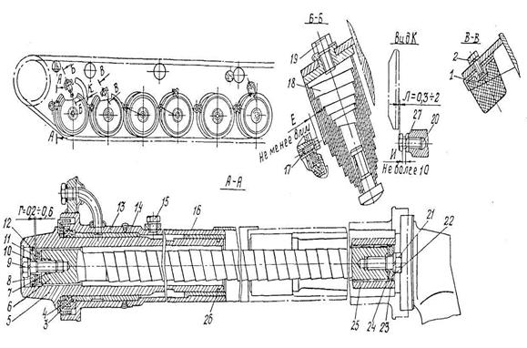 Балансир заменять при следующих · неисправностях: срыв резьбы более трех ниток; · трещины любого размера и расположения; · повреждения посадочной поверхности (задиры и наволакивания металла) оси катка; · погнутость балансира. ИНСТРУМЕНТ И ПРИСПОСОБЛЕНИЯ: ключи гаечные 14, 17, 22, 27 и 32-мм; ключи торцовые 14, 22 и 27-мм; ключ торцовый Г-образный 22-мм; ключ накидной 27-мм; ключи специальные 765-93-289 или КС-6, 765-100-127 или КС-6, ключ-трещотка 765-93-сб190; приспособления 765-93-сб164; 765-93-сб170: УК-1А, УК-8А, УК-6 или 765-100-118, УК-10А, УК-12А, УК-17; 700-28-сб124; гайка М16Х1,5; гидропресс ГП-20; конус К-6; шаблон; три штыря 700-48-156; стрелка 765-100-124; выколотка В-20; нить; линейка; динамометр; щуп; индикатор со стойкой; штангенциркуль; отвертка; плоскогубцы; молоток; бородок; зубило; шплинтовыдергиватель; спецломик; домкраты (2 шт.); лом; кувалда; банки со смазкой солидол С, со смазкой АМС-3 или МС-70, смазкой Литол-24, с суриком или белилами; ванна с керосином. ТЕХНИЧЕСКИЕ ТРЕБОВАНИЯ НА МОНТАЖ БАЛАНСИРА: а) перед сборкой привалочные поверхности и шлицы смазать смазкой солидол С или Литол-24; б) катки с балансирами устанавливать по средней линии, проведенной черезоси симметрии направляющего и ведущего колес так, чтобы плоскость симметрии катков отклонялась от этой средней линии не более чем на 3 мм; регулировать прокладками 4; в) осевой люфт Г балансира (0,2—0,6 мм) регулировать прокладками 7 и 11 в положении, при котором балансир прижат к торцу кронштейна подвески; г) большую и малую втулки, а также шейки балансира при сборке смазать смазкой солидол С, в полость между втулками заправить 250 — 300 г той же смазки; большую втулку передней подвески после сборки дополнительно прошприцевать до полного заполнения полостей смазкой и выхода ее во второе смазочное отверстие; д) зазор Л (0,3 — 2) после выставки колец катков отрегулировать и проверить прокачкой передних балансиров по всей длине боковых упоров; при этом проверять размер И (не более 10 мм) между гайкой 27 и головкой упора 20; после регулировки упор застопорить от самоотвинчивания тугой затяжкой гайки 27 уси-
