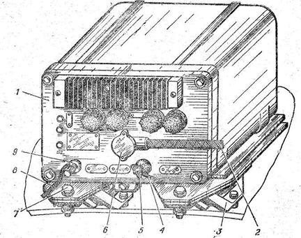 1 — блок питания; 2 — кабель питания; 3 — кронштейн; 4 — провод питания; 5 — гайка-барашек; 6 — колодка разъема; 7 — болты; 4 — провод «массы»; 9 — вывод «масса». Рисунок 2.34. - Установка блока питания радиостанции Р-123М.