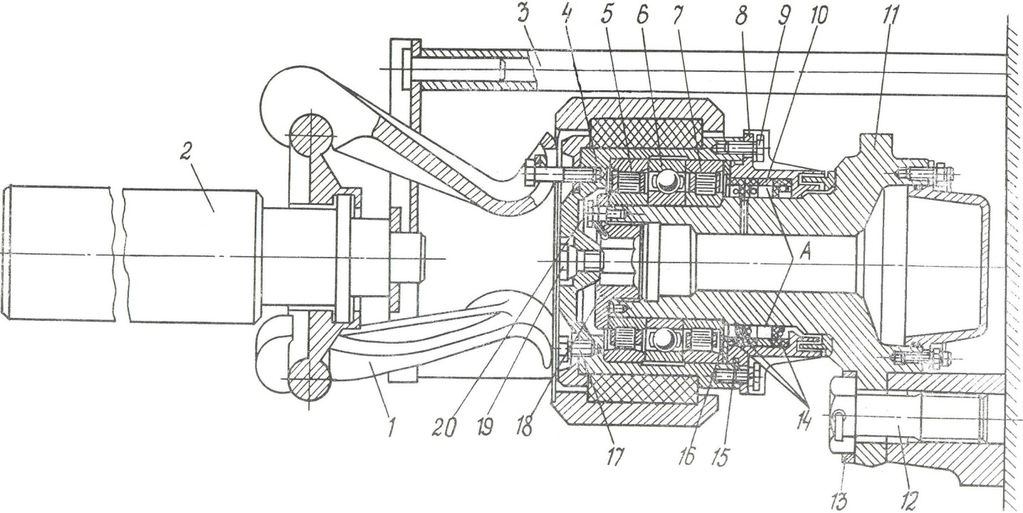 1 – приспособление УК-1А; 2 – гидропресс ГП-20; 3 – упорная рама для спрессовки обода с шиной; 4 – ступица с шиной; 5, 7 – роликоподшипники; 6 – шарикоподшипник; 8 – крышка уплотнения; 9, 12, 17, 20 – болты; 10 – кольцо; 11 – кронштейн; 13 – стопорная шайба; 14 – манжеты; 15 – уплотнительное кольцо; 16 – регулировочное кольцо; 18 – гайка; 19 – пробка; А – полость. Рисунок 3.13. - Поддерживающий каток с приспособлением УК-1А для спрессовки ступицы с шиной.