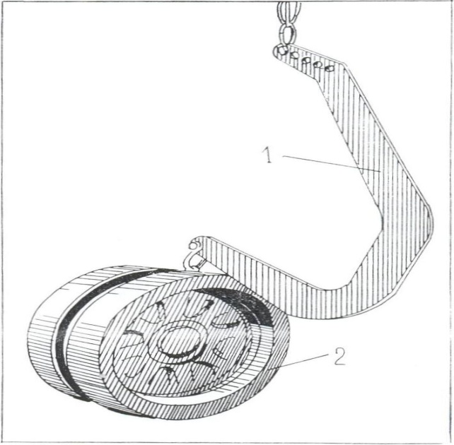 1 – опорный каток; 2 – приспособление 175.95.004сб-1 Рисунок 3.16. - Установка приспособления 175.95.004сб-1 для зачаливания опорного катка.