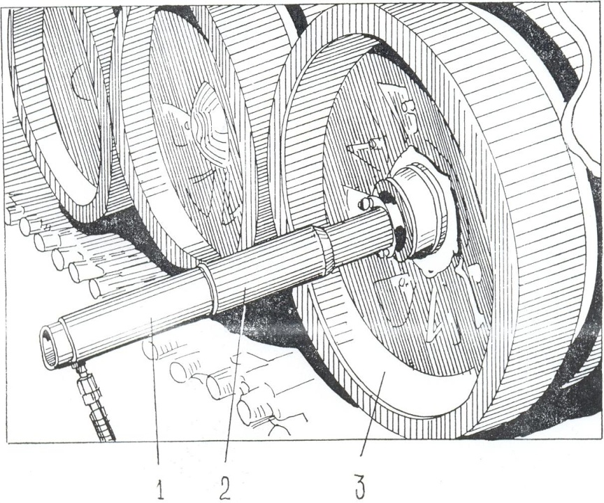1 – гидропресс ГП-20; 2 – приспособления УК-8Бсб с наконечником УК8-10; 3 – опорный каток. Рисунок 3.17. - Установка приспособления УК-8Бсб для напрессовки опорного катка.