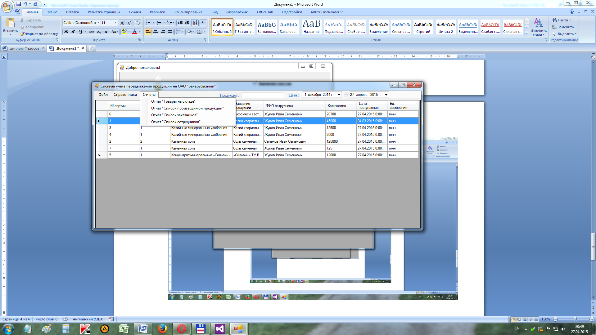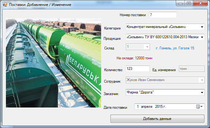 Данный программный продукт разработан для учёта передвижения продукции на ОАО «Беларуськалий». Для выполнения данной функции используется: главная форма приложения, с помощью которой можно добавлять продукцию на склад и создавать приходную накладную; форма «Справочник «Отгрузка продукции»», которая позволяет вносить информацию об отгрузке продукции заказчику и создавать накладную по отгрузке; форма «Передвижение продукции», с помощью которой можно отследить сколько продукции поступило на склады и сколько было отгружено заказчикам за выбранный период. Форма добавления данных для поступивших товаров на склад для администратора и для сотрудника отличаются. Для администратора на форме добавления нужно выбрать сотрудника, принявшего продукцию, и номер склада, на который привезли товар (рисунок 3.5), а для сотрудника эти поля уже будут заполнены данными о сотруднике, под которым был осуществлен вход в приложение (рисунок 3.6).