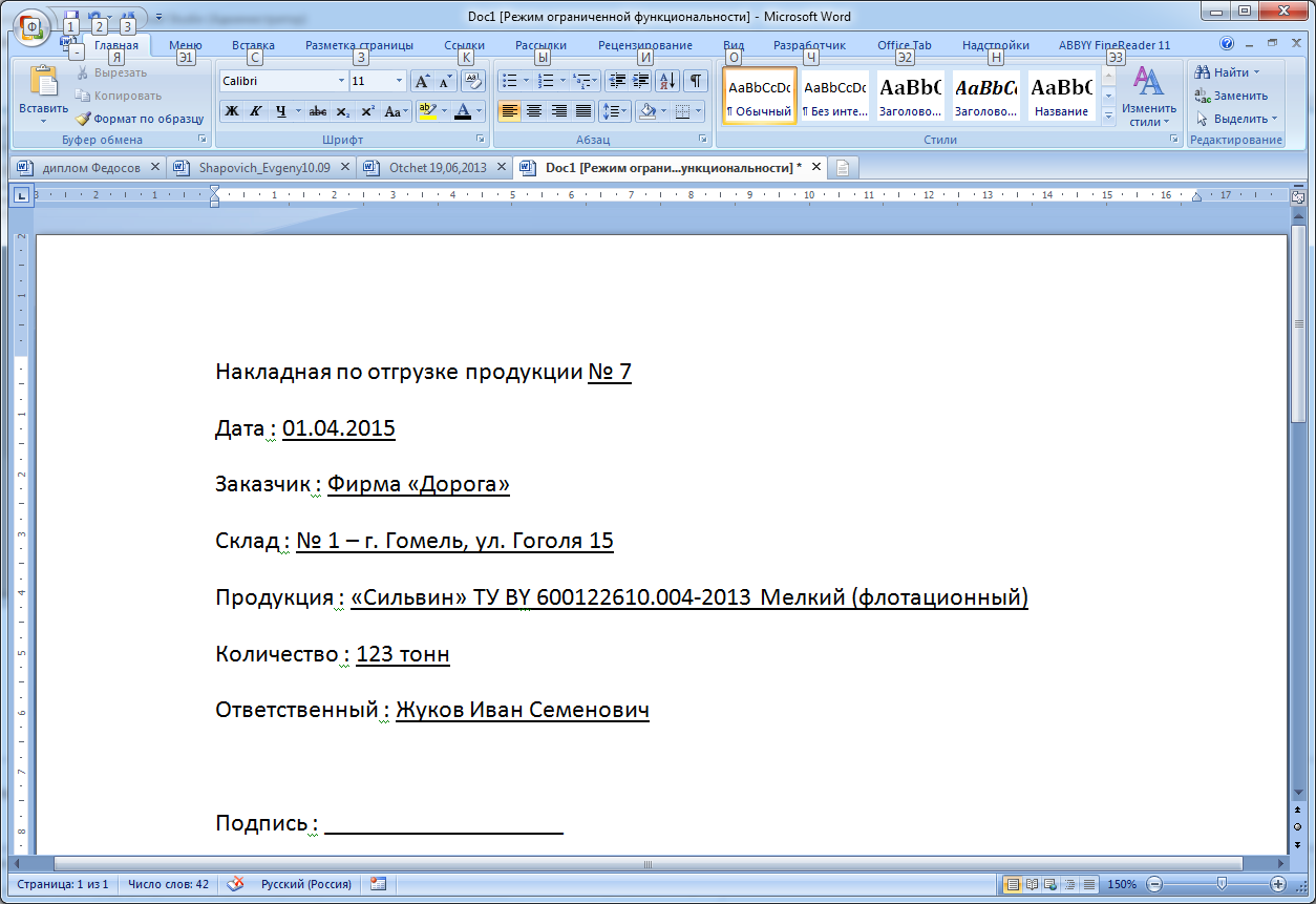 Меню «Файл» формы «Справочник «Отгрузка продукции»» отличается для администратора и для работника. Для администратора доступны все функции формы, для работника не доступны функции редактирования и удаления данных. Форма добавления данных для отгрузки продукции для администратора и для сотрудника также отличаются. Для администратора на форме добавления нужно выбрать сотрудника, отпускающего продукцию, и номер склада, с которого идет отгрузка (рисунок 3.13), а для сотрудника эти поля уже будут заполнены данными о сотруднике, под которым был осуществлен вход в приложение (рисунок 3.14). При добавлении и изменении данных о поставке автоматически формируется накладная по отгрузке продукции в MS Word. Пример формирования накладной по форме, представленной на рисунке 3.14, представлен на рисунке 3.15.