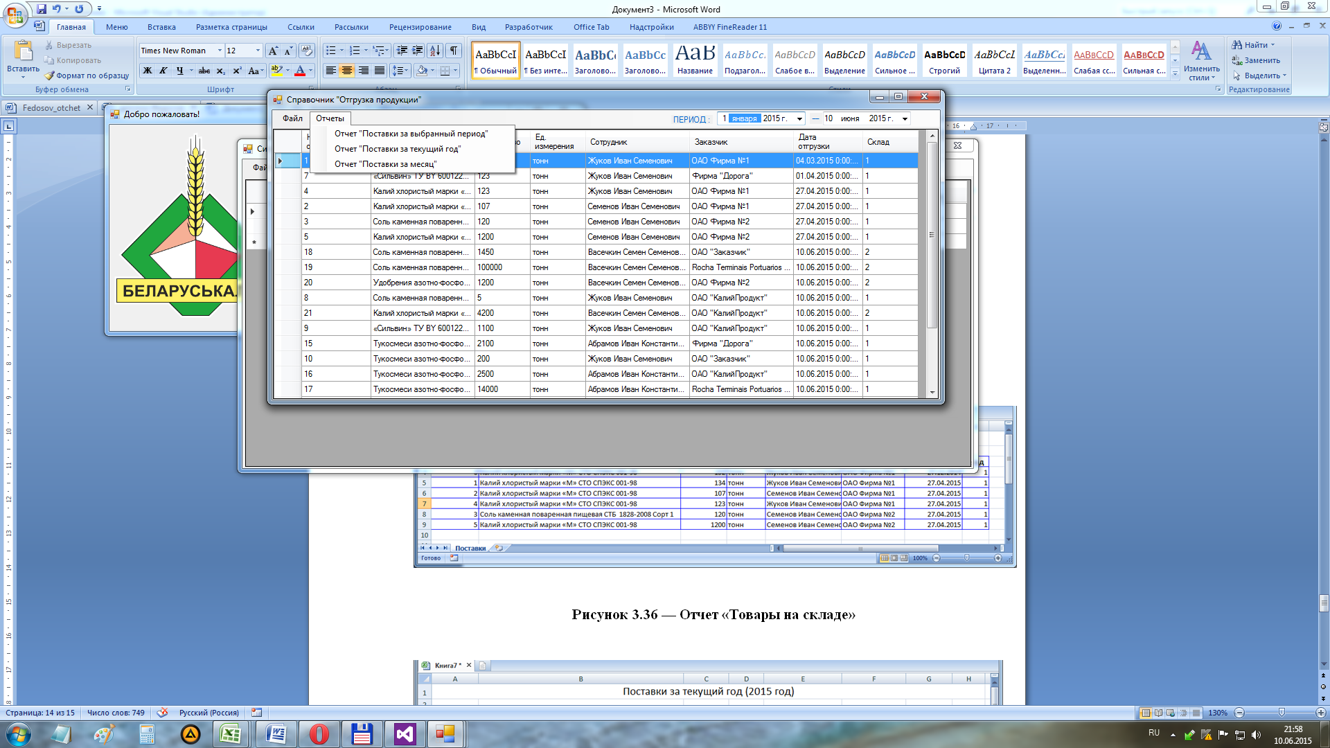 Информацию с данной формы можно сохранить в MS Excel выбрав «Отчеты->Сохранить в Excel» (рисунок 3.22). Также в меню отчеты можно получить информацию по отгрузкам продукции по заказчикам за выбранный период, за текущий месяц и за текущий год. Данные отчеты представлены на рисунках 3.23 – 3.24.