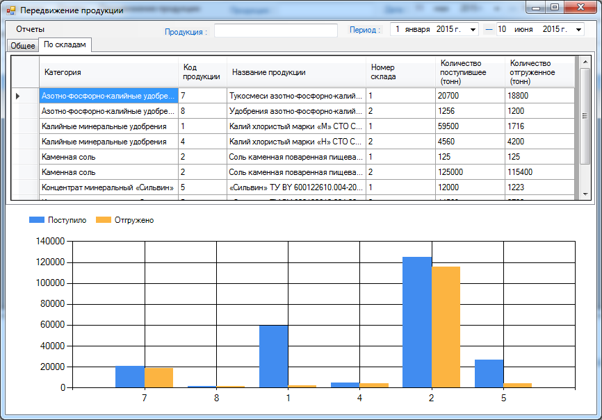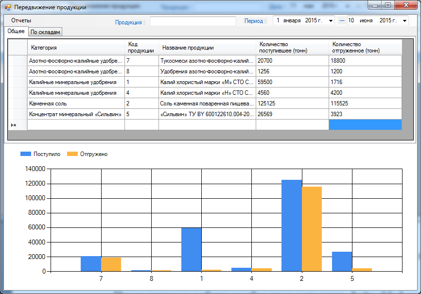 Форма «Передвижение продукции» представлена на рисунке 3.20. На данной форме отображается информация о передвижении продукции. На закладке «Общее» (рисунок 3.20) отображается количество имеющейся готовой продукции и количество отгруженной продукции за выбранный период, а на закладке «По складам» та же информация только разделенная по номерам складов (рисунок 3.21). Внизу формы представлена гистограмма, наглядно представляющая информацию, представленную на накладке «Общее». По оси абсцисс представлены номера продукции, по оси ординат количество продукции в тоннах.