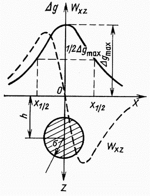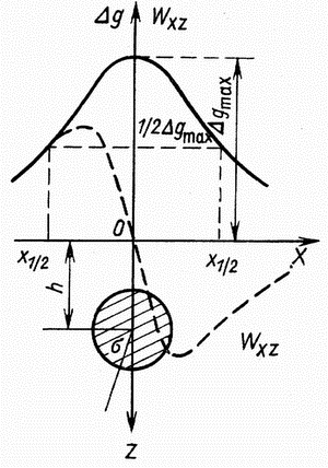ОБРАТНАЯ ЗАДАЧА ТЕОРИИ ПОТЕНЦИАЛА И МЕТОДЫ ЕЕ РЕШЕНИЯ. Нахождение аномалий силы тяжести и вторых производных потенциала от тел известной формы, глубины залегания, размера и плотности носит название прямой задачи гравиразведки. Определение местоположения, формы, глубины залегания, размеров и плотности тел по известным аномалиям В результате гравиразведки рассчитываются аномалии силы тяжести, обусловленные теми или иными плотностными неоднородностями, а влияние притяжения всей Земли и окружающего рельефа исключается вычитанием нормального поля и введением редукций (см. 1.2.3). Поэтому в математической теории гравиразведкирасcчитываются аномалии от тел простых форм: шара, горизонтального цилиндра, вертикального уступа, вертикального цилиндра и т.д. без учета притяжения всей Землей. Нахождение аномалий силы тяжести и вторых производных потенциала от тел известной формы, глубины залегания, размера и плотности носит название прямой задачи гравиразведки. Определение местоположения, формы, глубины залегания, размеров и плотности тел по известным аномалиям Обратная задача над шаром. Обратная задача. Из (1.11) максимум Для точки, удаленной от максимума на расстояние x1/2, имеющей