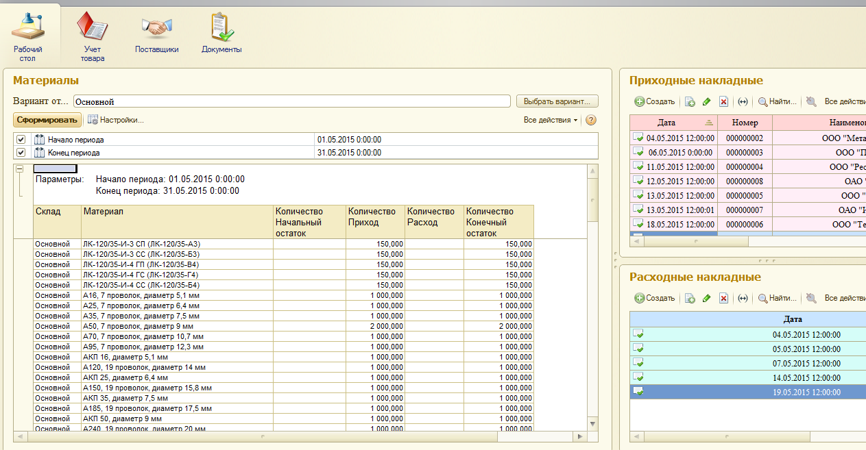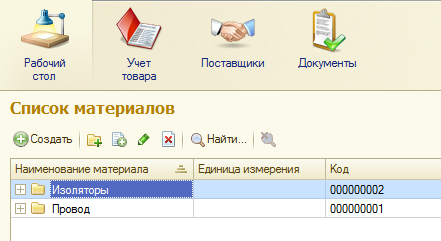 Настройка рабочего стола Рабочий стол предназначен для размещения наиболее частых используемых документов, отчетов, справочников и т.д. Поэтому нужно поместить на рабочий стол то, с чем пользователь при работе с прикладным приложением имеет дело наиболее часто. Для роли администратора на рабочий стол помещены в левую колонку отчет «Материалы», а в правую колонку список «Приходные накладные» и список «Расходные накладные». Для данной роли это будет наиболее актуально, потому что ему важна отчетность работы. На рисунке 37 можно просмотреть рабочий стол, который был составлен для роли «Администратор» в режиме 1С:Предприятие.