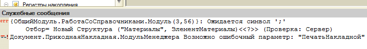 Рисунок 39 – Ошибки тестирования На рисунке представлен скриншот ошибки который гласит, что в общем модуле «Работа Со Справочниками» пропущен символ «;». После добавления данного символа в код общего модуля, данная ошибка пропала. Еще одна ошибка в модуле менеджера документа «Приходная накладная». После просмотра кода «Печать» был выявлен неверный параметр «Печать накладной». Данный параметр был исправлен в параметр «Печать» и ошибка устранилась. После проверки конфигурации система не выявила ошибок (Рисунок 40).