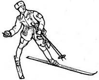 Для изготовки без разворота лыж в сторону необходимо не изменяя направление лыж, выдвинуть левую лыжу вперед, опустить правое колено на правую лыжу и сесть на каблук правой ноги (рис. 42).