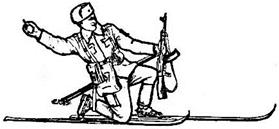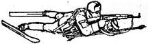 Рис.42 Изготовка для стрельбы с колена Для изготовки с разворотом правой лыжи следует развернуть ее носком вправо так, чтобы грузовая площадка находилась на заднем конце левой лыжи, и опуститься правым коленом на правую лыжу (рис. 43). Рис.43 Изготовка для стрельбы с колена с разворотом правой лыжи