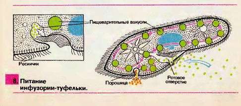 Реснички желобка непрерывно работают, создавая ток воды. Вода подхватывает и подносит ко рту основную пищу туфельки - бактерий. Через глотку бактерии попадают внутрь тела инфузории. В цитоплазме вокруг них образуется пищеварительная вакуоль, в которую выделяется пищеварительный сок. Цитоплазма у туфельки, как и у амебы, находится в постоянном движении. Пищеварительная вакуоль отрывается от глотки и подхватывается течением цитоплазмы. Переваривание пищи и усвоение питательных веществ у инфузории происходит так же, как у амебы. Непереваренные остатки выбрасываются наружу через отверстие - порошицу. Дыхание и выделение у инфузории-туфельки происходит так же, как и у других рассмотренных ранее простейших. Две сократительные вакуоли туфельки (спереди и сзади) сокращаются попеременно, через 20-25 с каждая. Вода и вредные продукты жизнедеятельности собираются у туфельки из всей цитоплазмы по приводящим канальцам, которые подходят к сократительным вакуолям. В цитоплазме туфельки расположены два ядра: большое и малое. Ядра имеют разное значение. На долю малого ядра приходится главная роль в размножении.